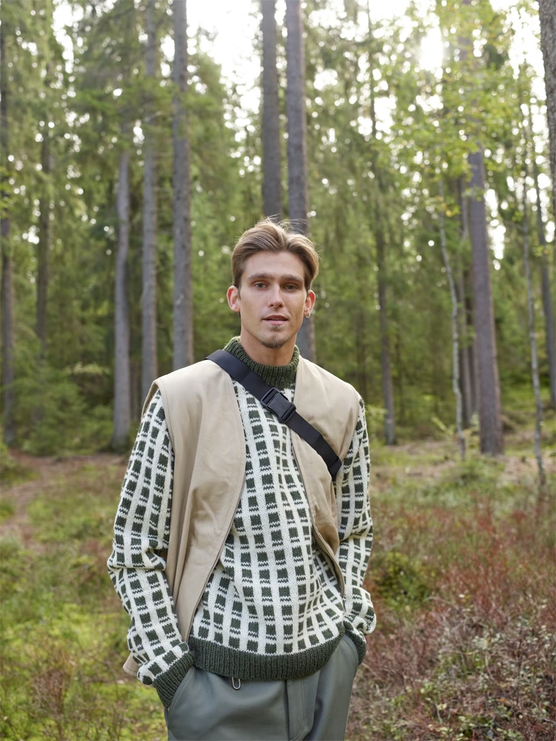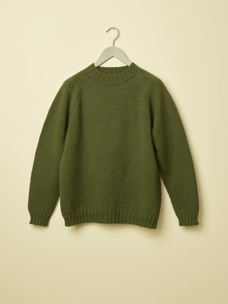 336-3 Spiret genser herre | Finull Mørk mosegrønn | Strikkepakke Rauma Garn