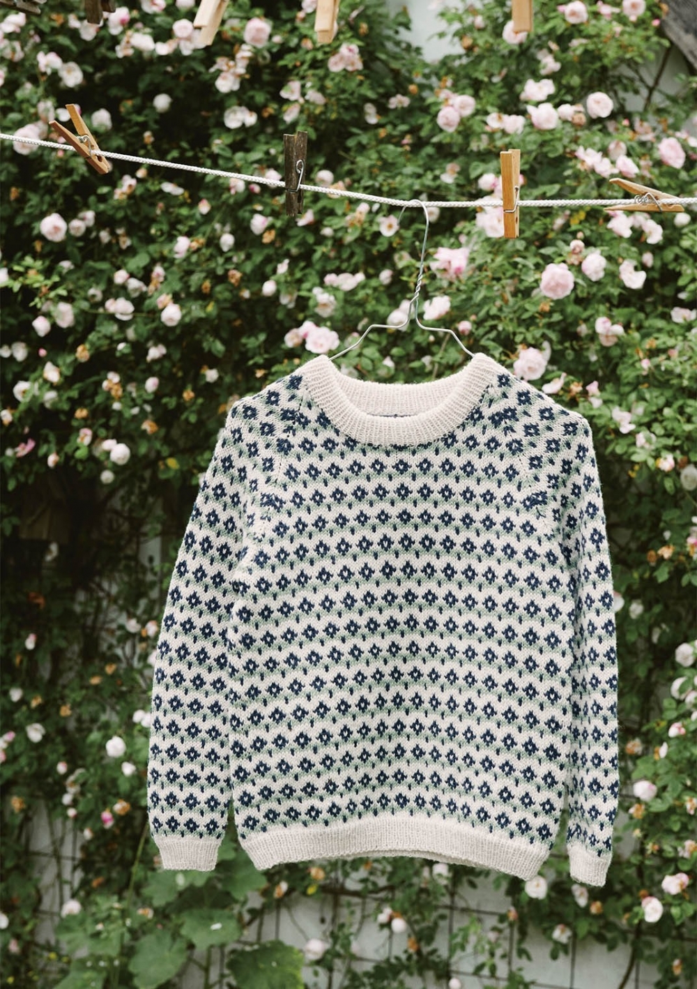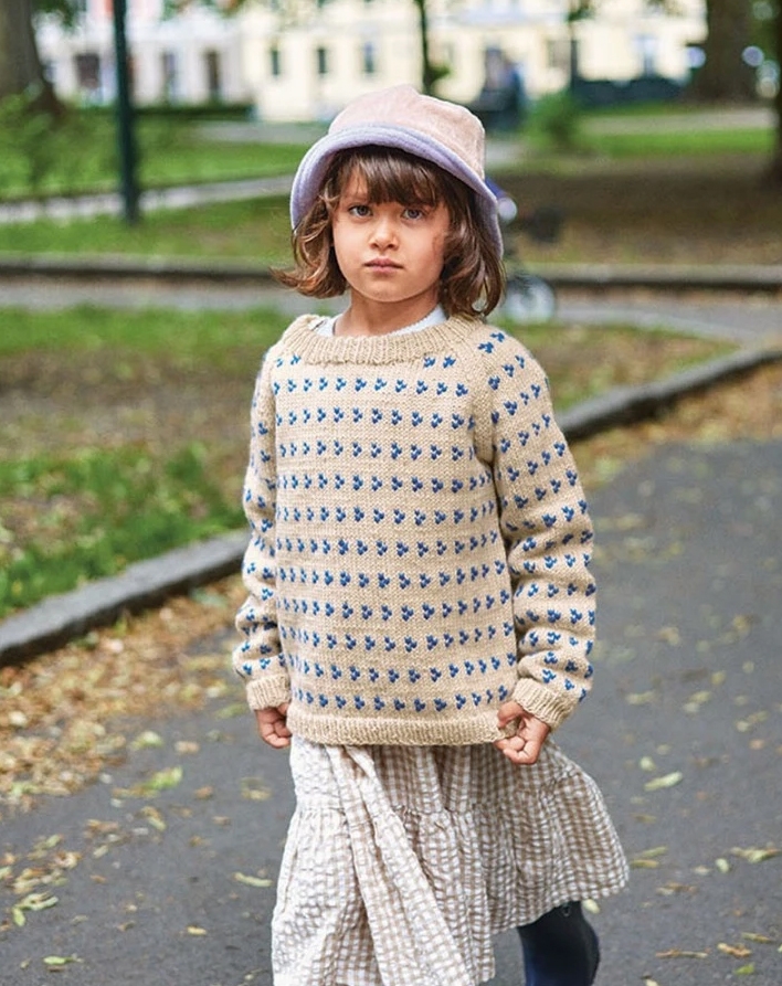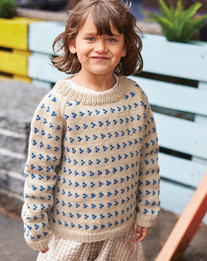 Raglangenser med mønster strikket i Sunday fra Sandnes Garn. Strikkepakken er med garn og oppskrift.
