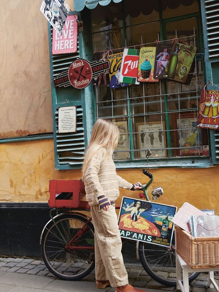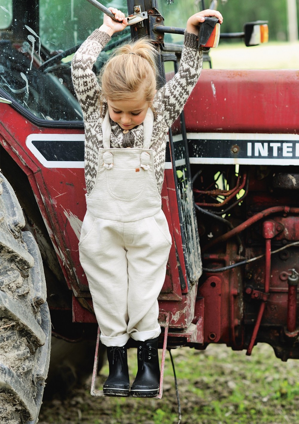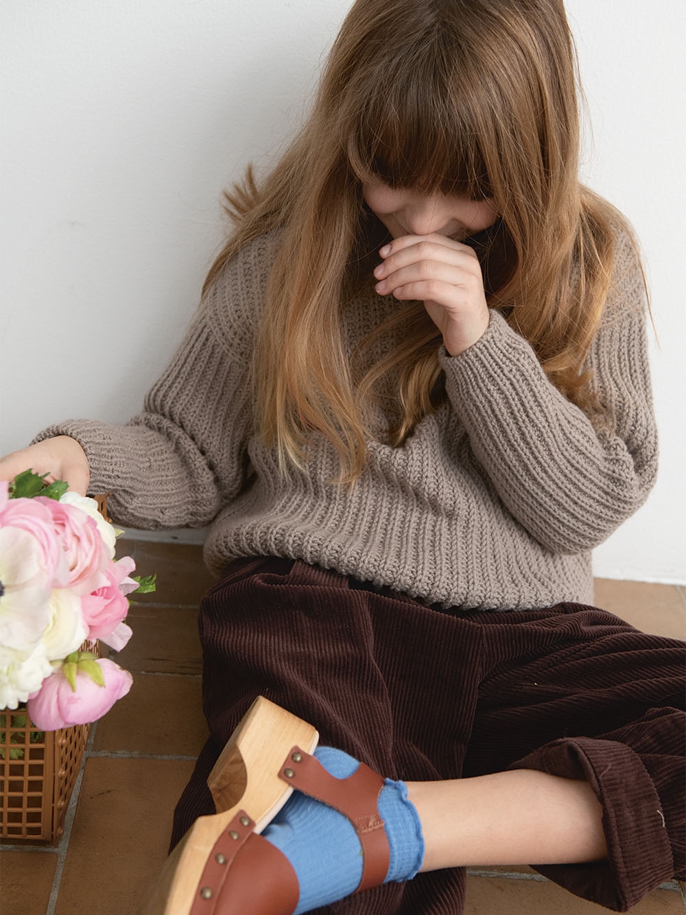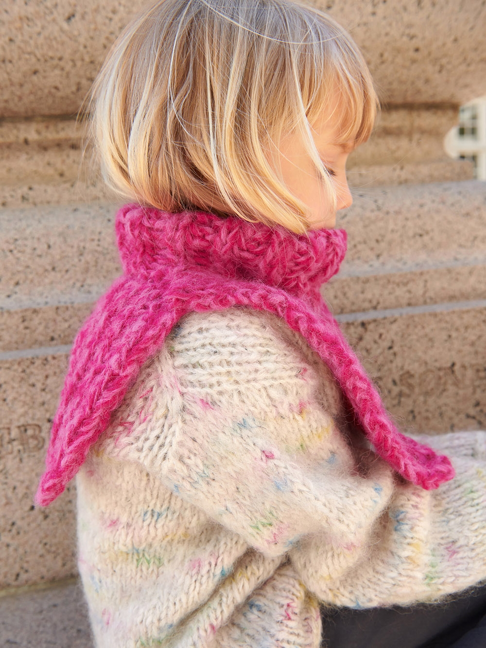 Chunky Dahlia Junior har et bærestykke som legger seg pent om skuldrene og kropp og ermer har en loose passform. Strikkepakke med garn og oppskrift.