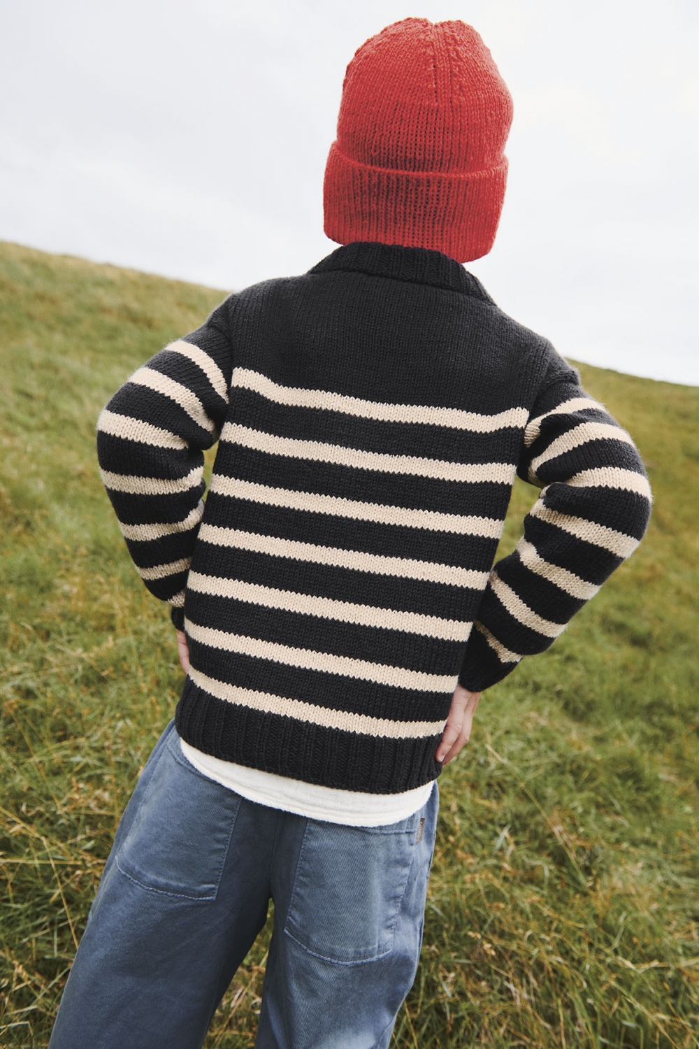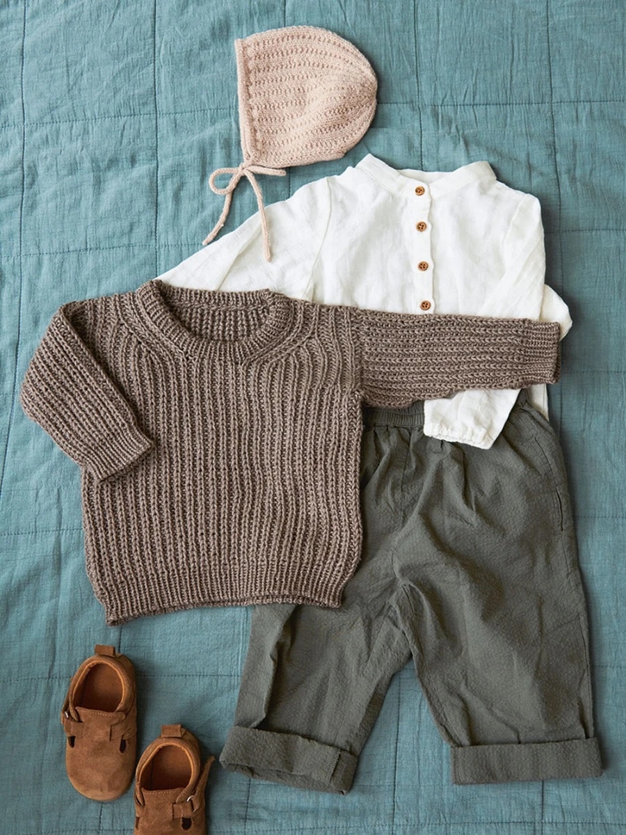 Strikkepakke med garn og strikkeoppskrift på Peters dobbel sjømannsribbb. Raglangenser strikket ovenfra i Sunday.