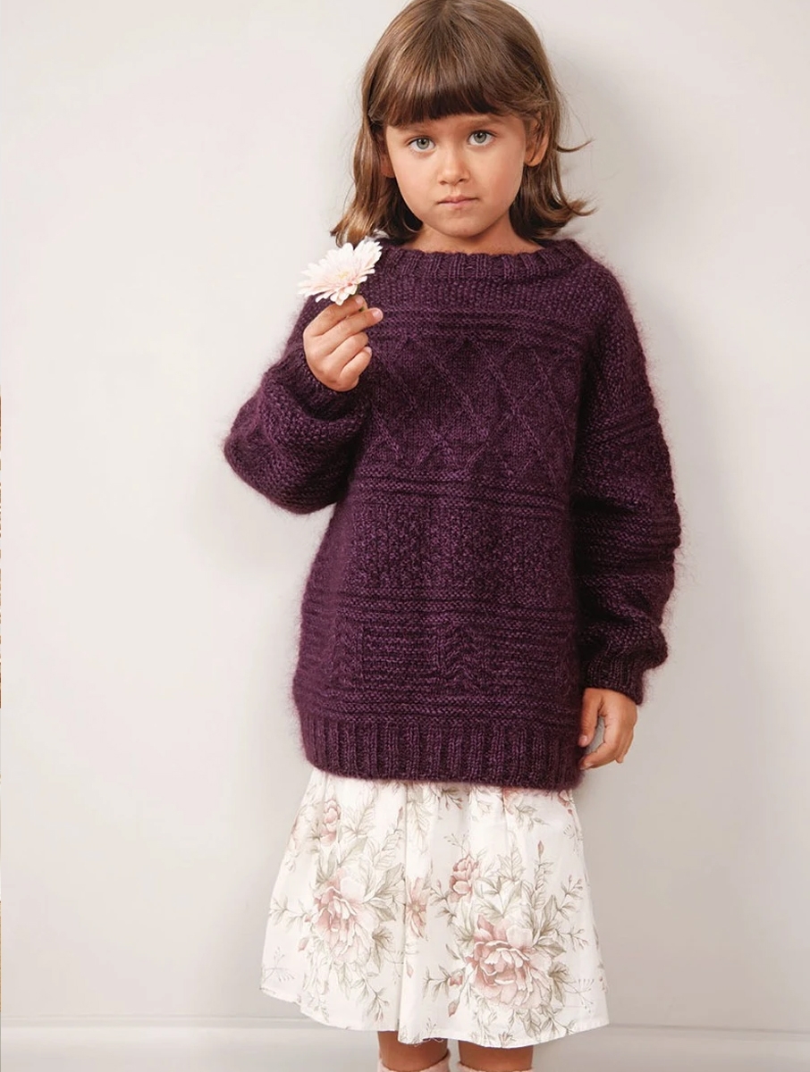 2212-9 Guernsey genser barn Tynn Peer Gynt og Tynn Silk Mohair Bjørnebærsaft Strikkepakke