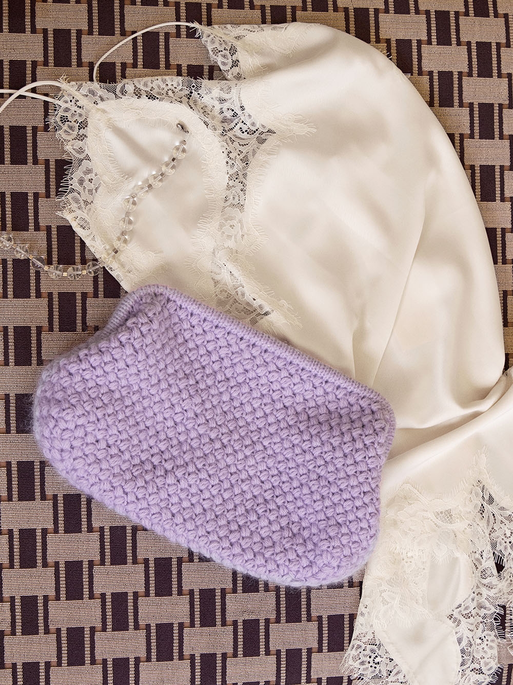 Hver enkelt oppskrift selges kun med garn. Dekorativ clutch heklet nedenfra og opp i puffmasker, med firkantet bunn og strikket kant rundt clutch-frame. Kombinasjonen av Double Sunday og Tynn Silk Mohair gir et mykt, lett og eksklusivt uttrykk.