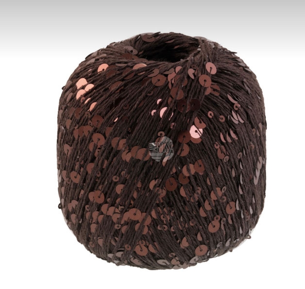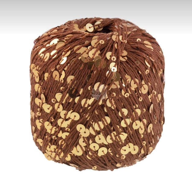 Effektgarn med paljetter.Bærende tråd av bomull med følgetråd med store og små paljetter, enten flerfargede eller ensfargede