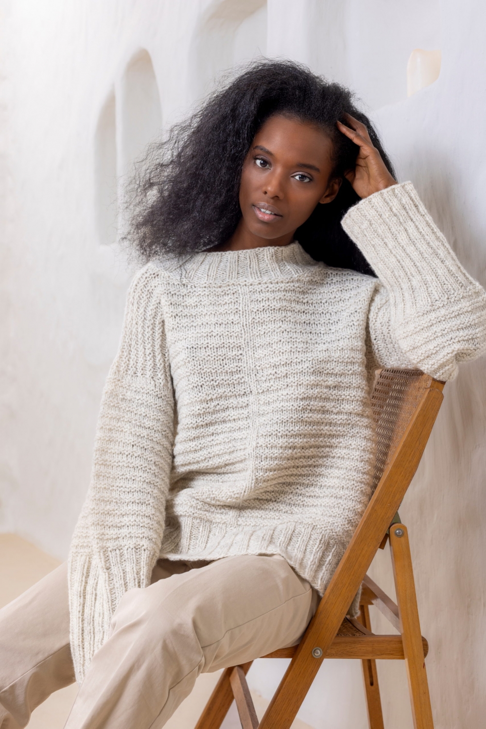 Hver enkelt oppskrift selges kun med garn. Papirversjon. Lyra Sweater i Ballerina Chunky Mohair kan strikkes både ovenfra og ned og nedenfra og opp. En tettsittende raglangenser med formet hals og ermer med trompetfasong.
