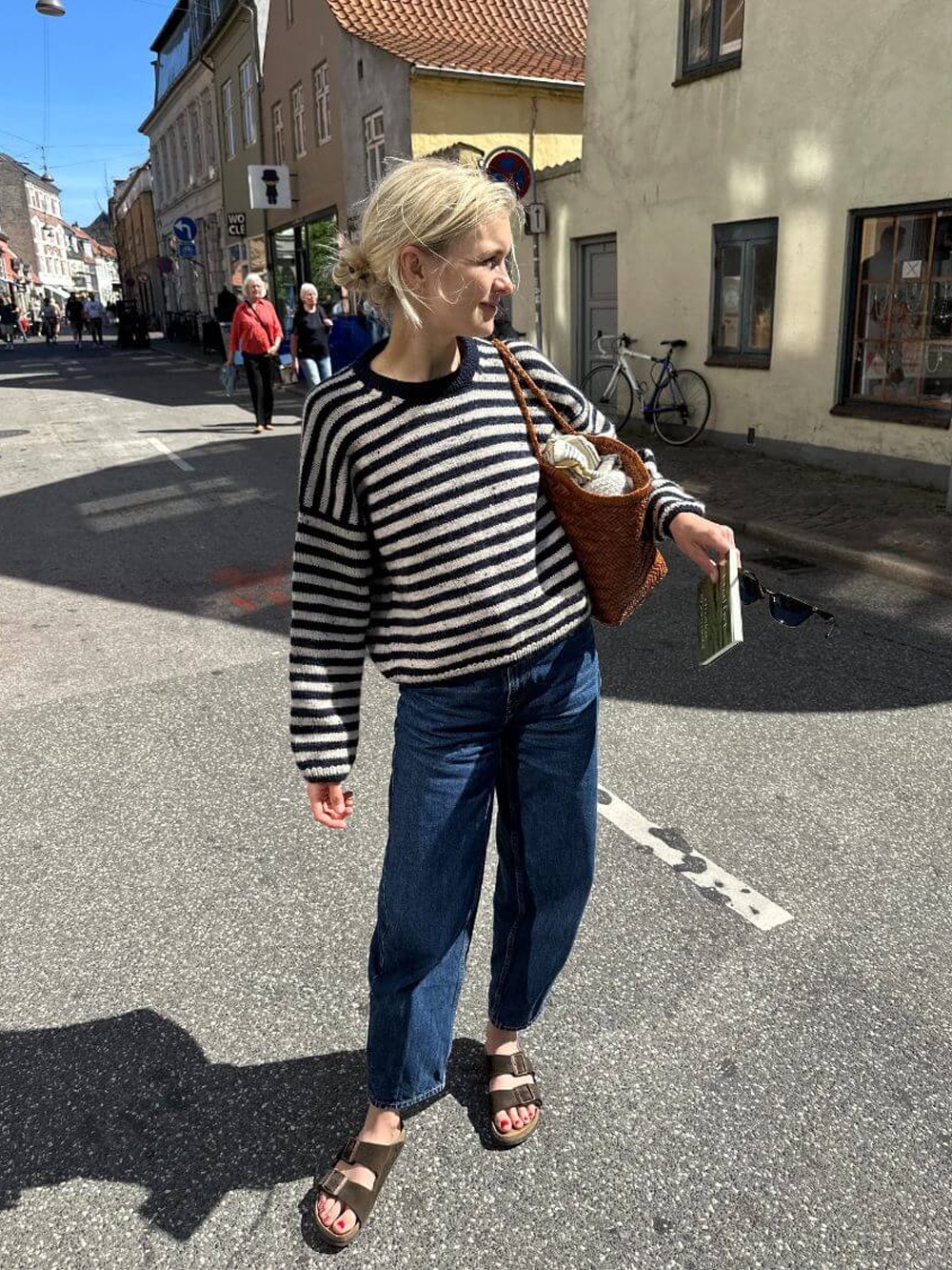 Oppskrift på Striper på Langs-genser fra PetiteKnit. Strikkes i Sandnes Sunday og Tynn Silk Mohair.