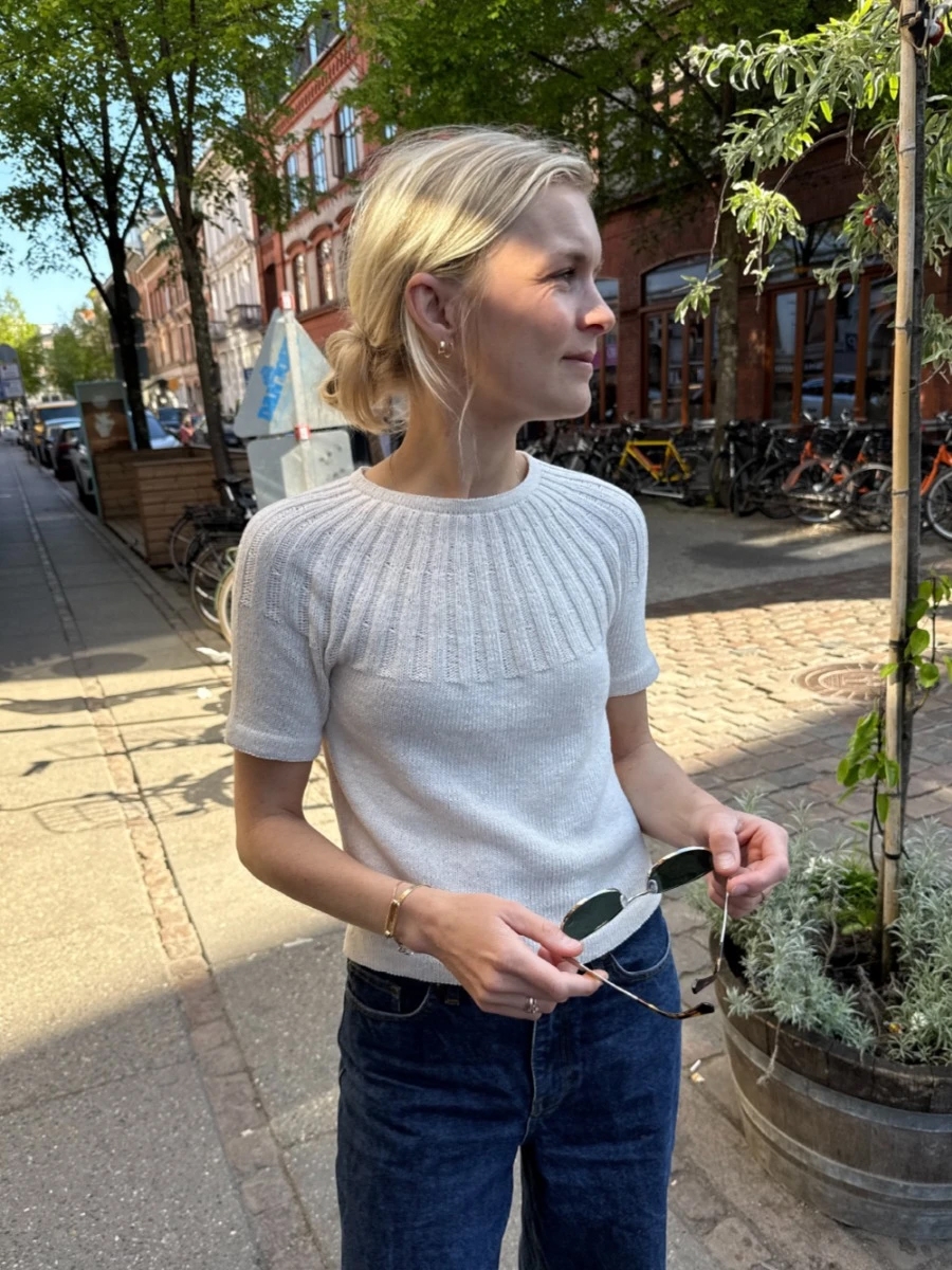 Enkeltoppskrift 112 - Friday Tee strikket i Sunday ovenfra og ned i perleribb med raglanøkninger. (Oppskriften selges KUN sammen med garn.)