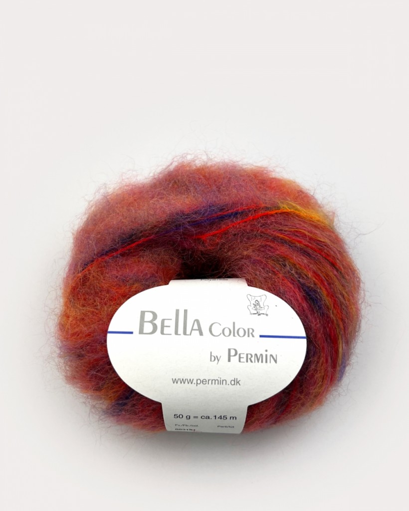 Bella Color by Permin er en av våre fargerike favoritter og har etter hvert blitt en klassiker i vårt sortiment. Komposisjonen er en klassisk kid mohair med ull, som gir det karakteristiske langhårede uttrykket. Garnet er lett og varmt, og egner seg spesielt godt til store gensere og kjoler, da det beholder et lett og luftig uttrykk, selv i et stort arbeid. Denne chunky mohairen har fine fargeforløp som gir et håndfarget uttrykk til arbeidet ditt. Kombiner det med en ensfarget tråd, strikk det alene eller sammen med flere, for å få ditt helt eget uttrykk.
