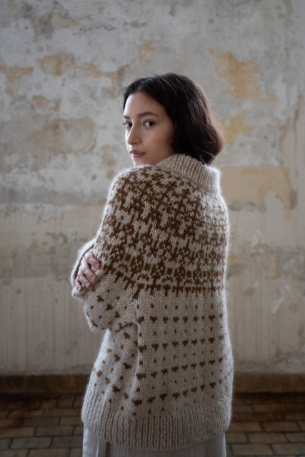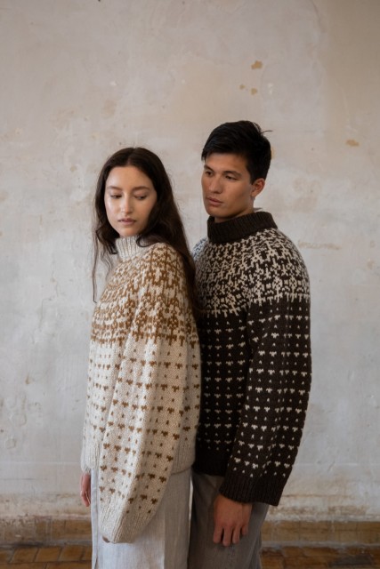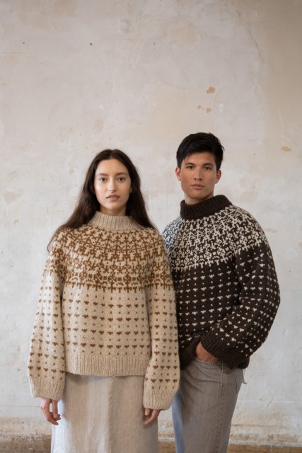 – Farge B (mønsterfarge): Luna lamullgarn i fargen 440 okerbrun (200 m pr 100g), strikkes sammen med Isager Silk Mohair i fargen 63 (212 m pr 100g).