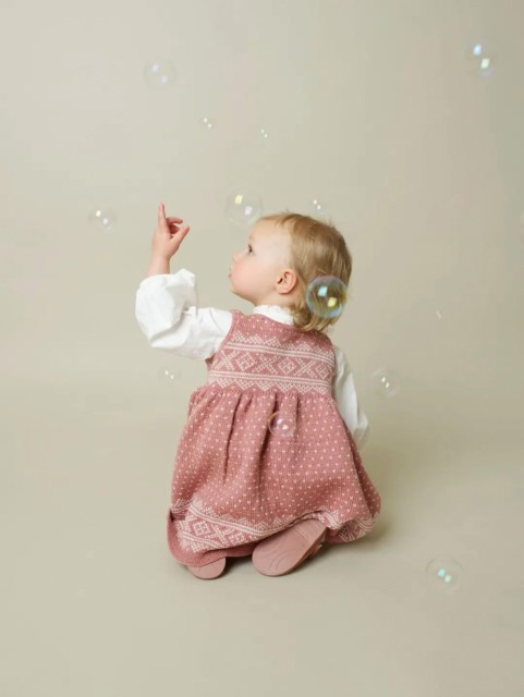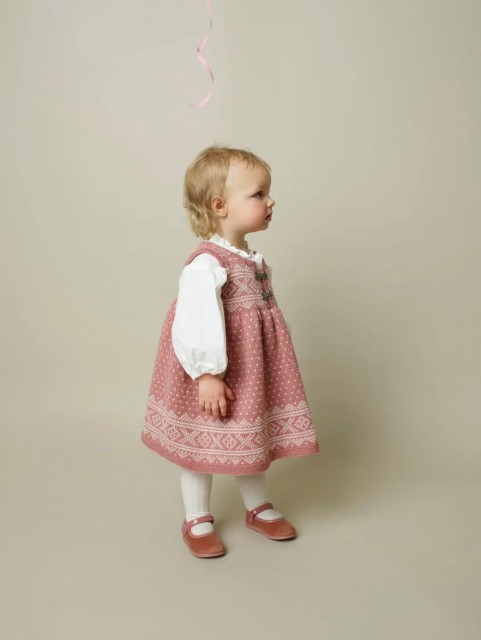 Kjolen strikkes rundt nedenfra og opp. Overdelen har åpning midt foran som syes og klippes opp før forkantene strikkes på. Kjolen lukkes foran på livstykket med hekter.