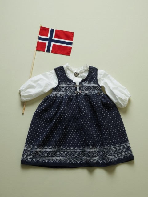 Kjolen strikkes rundt nedenfra og opp. Overdelen har åpning midt foran som syes og klippes opp før forkantene strikkes på. Kjolen lukkes foran på livstykket med hekter.