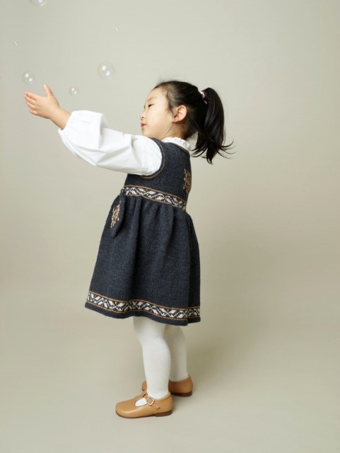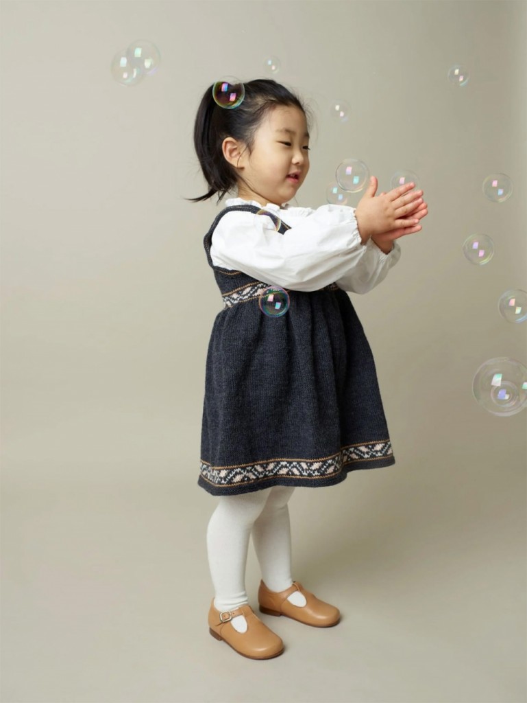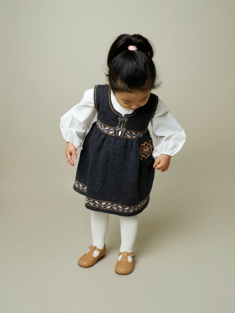 Kjolen strikkes rundt nedenfra og opp. Rosemønsteret på ryggen og vesken kan enten strikkes eller broderes på tilslutt med maskesting.