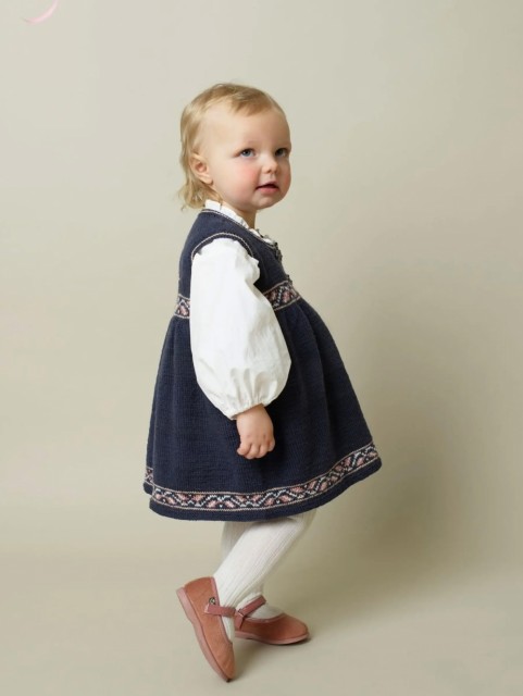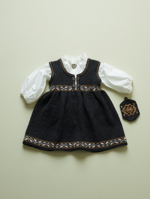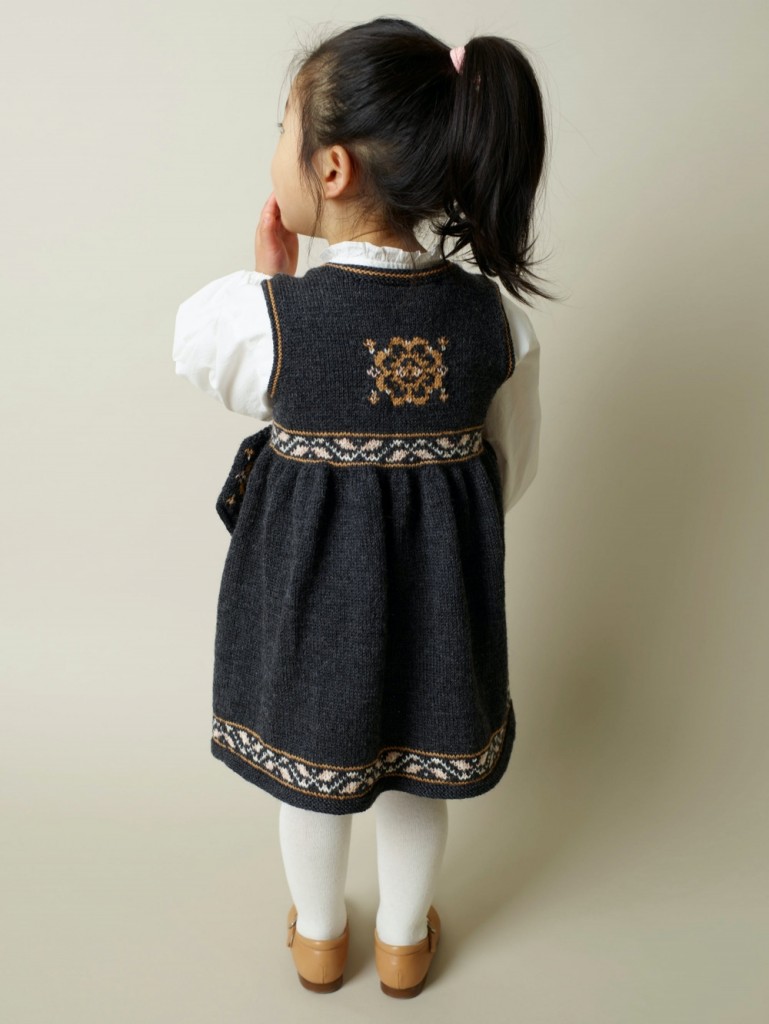Kjolen strikkes rundt nedenfra og opp. Rosemønsteret på ryggen og vesken kan enten strikkes eller broderes på tilslutt med maskesting.