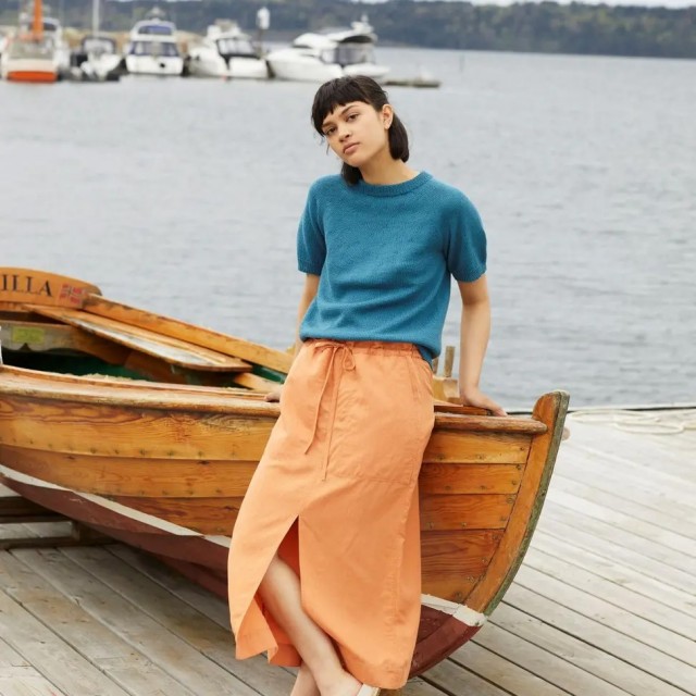 Skimre tee er en kortermet topp med rundt bærestykke og ribbestrikkede kanter. Toppen strikkes i glattstrikk ovenfra og ned. Halskanten brettes dobbel innover. For å få en avslappet fasong, strikk en størrelse som er 4-8 cm større enn brystvidden din.
