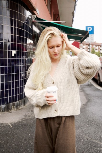 Kort Dagmarjakke er en moderne og stilren jakke i halvpatent, som strikkes ovenfra og ned i myk, norsk lamull. Jakken har european shoulder-konstruksjon og dyp v-hals. Ermene formes ved å felle på yttersiden, noe som gir synlige og dekorative linjer i plagget. Halvpatent gir dybde, tekstur og et luksuriøst uttrykk, og den myke lamulla gir følelsen av å bli omfavnet av et mykt og lunt pledd. Kort Dagmarjakke er en kort versjon av den lange Dagmarjakken, og i tillegg har stilige “utenpå”-lommer.