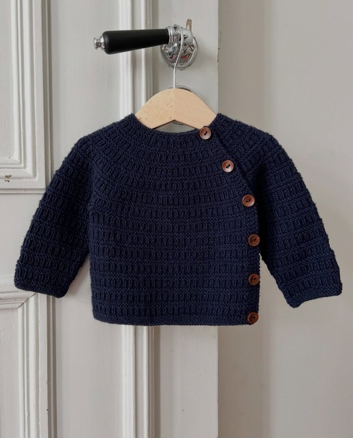Sorgenfri omslagsjakke Light strikkes ovenfra og ned i strukturstrikk. Først strikkes bærestykket med jevnt fordelte økninger. Deretter settes ermemaskene på hviletråd mens resten av kroppen strikkes. Ermene strikkes så rundt på settpinner.
