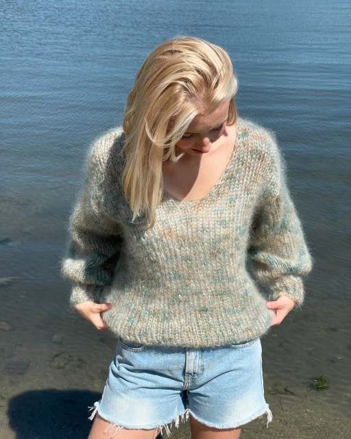 En kjappstrikket genser med v-hals og vide ermer på tykke pinner. Dette er en genser som passer til alt og i alle. Lett og myk strikk som er laget i et fantastisk mohair og ullgarn. Her kan du strikke deg en enkel genser som matcher det du har fra før i klesskapet.
