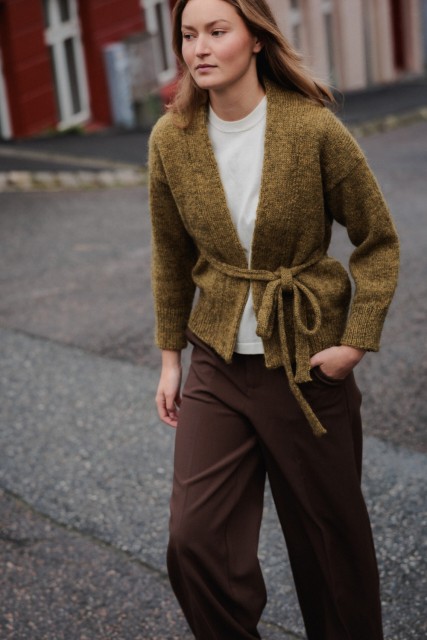 Glattstrikket cardigan med belte i dobbeltstrikk. Jakken strikkes ovenfra og ned, og har dobbeltstrikkede kanter for en pen avslutning.