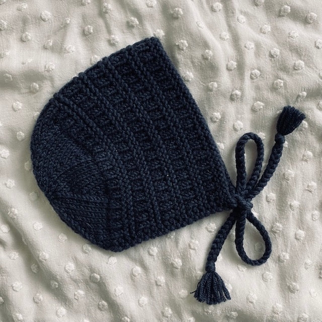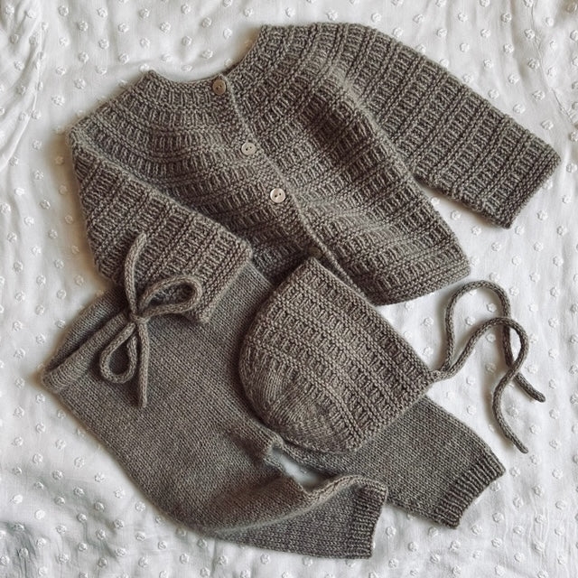 Sorgenfri kyse strikkes frem og tilbake på pinnen i strukturstrikk fra pannen og bakover. Deretter strikkes bakhodet i glattstrikk rundt på settpinner med fellinger. Til slutt strikkes en i-cord snor i hvert hjørne av kysens nedre kant.