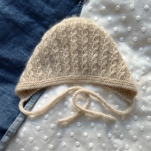 Uranienborg kyse strikkes frem og tilbake på pinnen i fletteribb fra pannen og bakover. Deretter strikkes bakhodet rundt på settpinner i glattstrikk med fellinger. Til slutt strikkes knytesnorer.