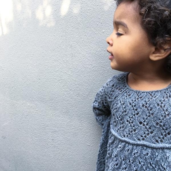 Først strikkes bjellene, heretter strikkes skjørtet rundt i Hollymønstret hele veien opp tilermeåpningen. Ermerne er 3/4 lange og strikkes også i Hollymønsteret, og strikkes sammen medskjørtet ved hjelp af raglan.