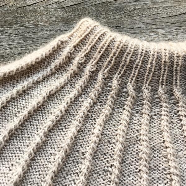 Bjørksweateren strikkes rundt oppefra og ned.