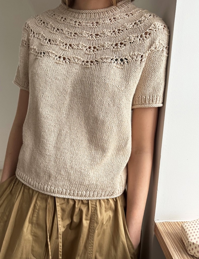 Noomi Tee strikkes ovenfra og ned, og halsutskjæringen formes med vendepinner etter at halskanten er strikket.