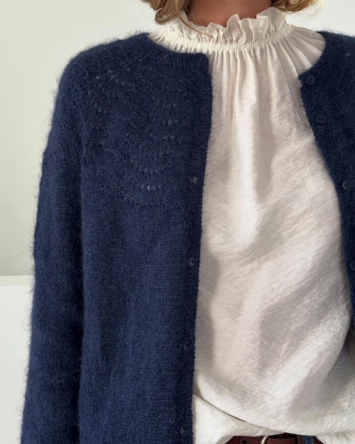 Peacock Cardigan fine strikkes ovenfra. Først strikkes det runde bærestykke med mønster etter diagram, deretter strikkes vendepinner, som gjør halsutringningen dypere foran enn bak. Bol og ermer ferdig for seg i glattstrikk. Til slutt strikkes forkanter og halskant, og det sys i knapper.