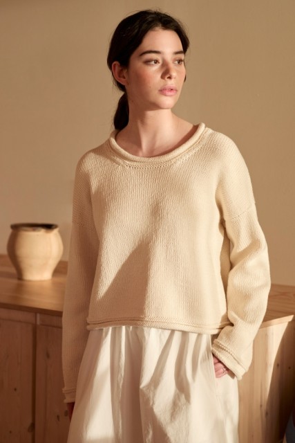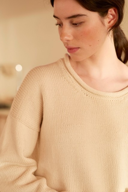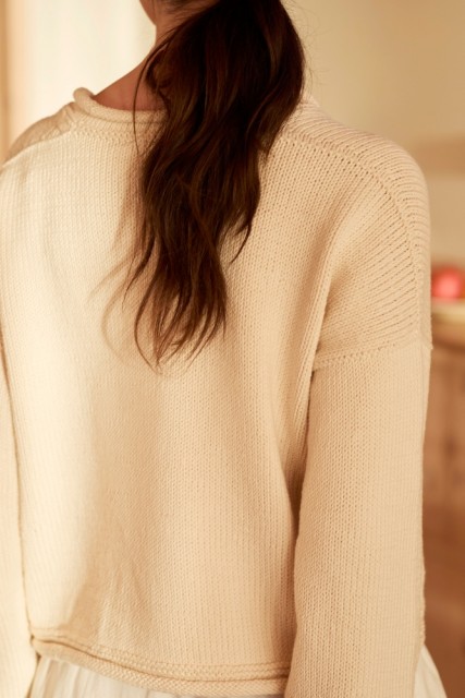 Emina sommergenser er en deilig genser med pene detaljer. Genseren strikkes ovenfra og ned i glattstrikk og med rullekanter. Rillene langs skuldrene, rundt halsen, ermene og bolkanten gir genseren det lille ekstra og skaper en vakker helhet.