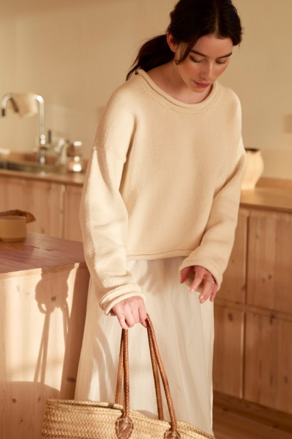 Genseren strikkes i Tjukk Bomull, et premium garn av pima bomull. Det gir en vakker glans og behagelig tyngde som ligger mykt mot huden. Med sin korte og romslige fasong passer genseren perfekt over kjoler, skjørt og vide bukser. Ønsk sommeren velkommen med en Emina sommergenser i skapet!