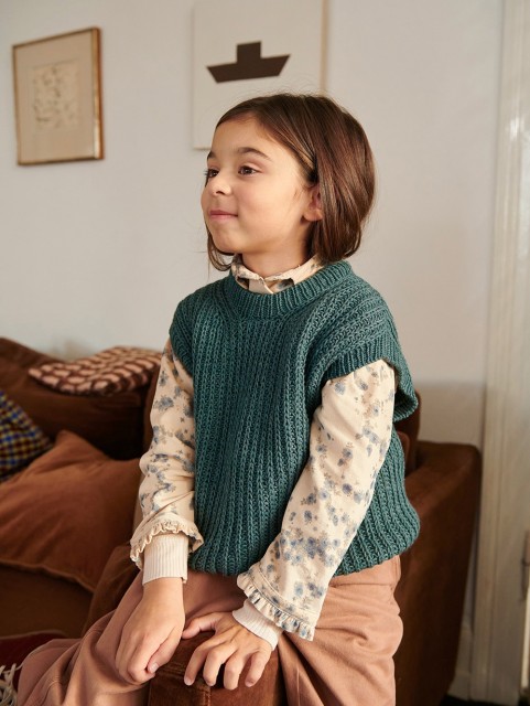Loui Slipover Junior er et anvendelig plagg som passer både alene og over skjorte eller genser. Slipoveren strikkes ovenfra og ned i halvpatent og strikkes i Duo – en slitesterk og behagelig kvalitet for barn.