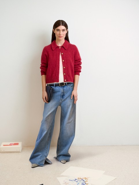 Cardigan strikket ovenfra og ned med én tråd Sunday og én tråd Tynn Silk Mohair. Formede skuldre, glattstrikkede partier og avsluttet med forkanter og krage.