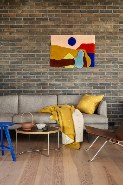 "Pastille" følger en Røros Tweed-tradisjon av nordiske grafikkelementer. Det åpne rutenettet med kontrast prikker etterlater et rent og strukturert inntrykk.